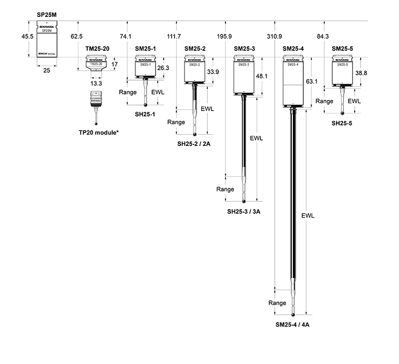 Характеристики каждого сканирующего модуля SM25-х оптимизированы с точки зрения усиления и жесткости пружины таким образом, чтобы соответствовать указанному диапазону длин щупов. Для каждого модуля предусмотрен соответствующий держатель щупа SH25-х.