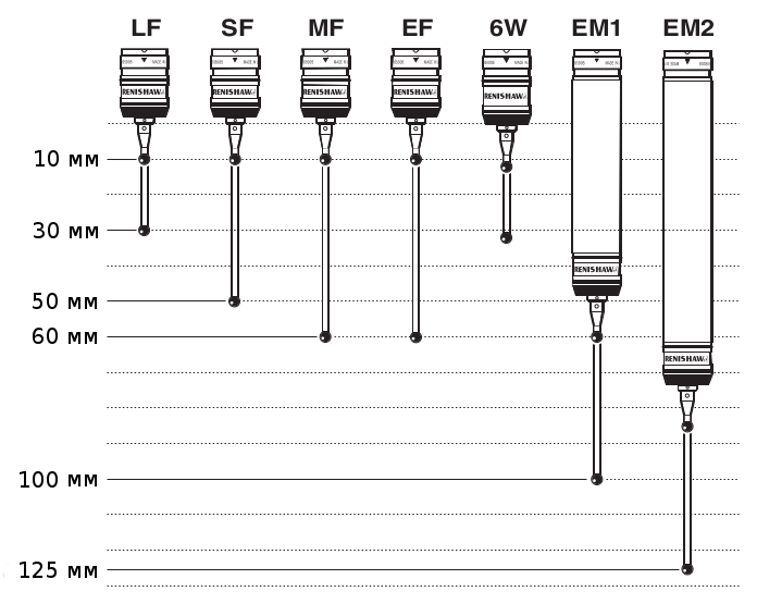 Обеспечивая целый диапазон усилий срабатывания, эти модули позволяют оптимальным образом выбирать характеристики датчика для выполнения конкретной задачи. Предлагается набор различных удлинителей, а также модуль, работающий в 6 направлениях. В контактный модуль можно непосредственно устанавливать щупы серии M2 компании Renishaw.
